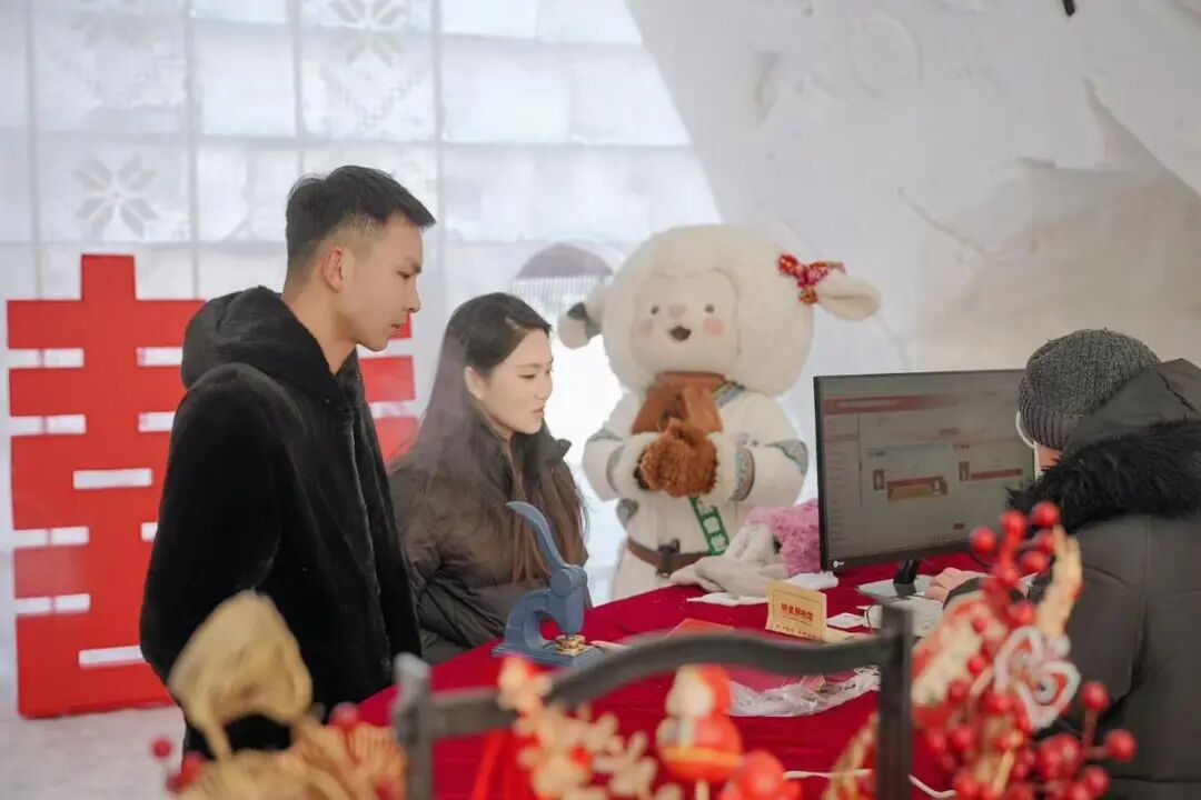 婚姻登记工作人员为新人颁发结婚证的温馨瞬间 包头市以“一元复始,相伴一生”为主题,举办特色集体颁证活动。在亲友与工作人员的共同见证下,173对新人身着盛装,依次登台领取结婚证、宣读婚姻誓词,庄重的仪式感让婚姻的责任与意义更加凸显。登记处提前优化流程、调配人力,通过“线上预约+线下快办”模式减少等待时间,让新人在温馨喜庆的氛围中开启婚姻新旅程。 呼伦贝尔市 冰雪民俗+专属服务 浪漫体验有特色 绒绒雪世界冰雪酒店内新人在冰雪登记窗口领证场景 呼伦贝尔市深挖冰雪资源与民俗特色,创新打造“婚登+冰雪+民俗”融合服务模式。在绒绒雪世界冰雪酒店设立新年冰雪主题专属临时登记窗口,为20对预约新人提供“冰雪入场—签名打卡—民俗互动—专属颁证”全流程服务,登记新人及亲友可免费入园体验。同时,心理专家与婚姻家庭咨询师现场提供一对一辅导,机器人乐队奏响婚礼进行曲,让新人在银装素裹的浪漫氛围中定格幸福时刻。 赤峰市翁牛特旗 贴心服务+健康护航 幸福启程有保障